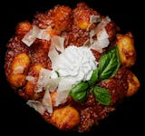 potato gnocchi with homemade ragu bolognese sauce topped with fresh ricotta cheese.